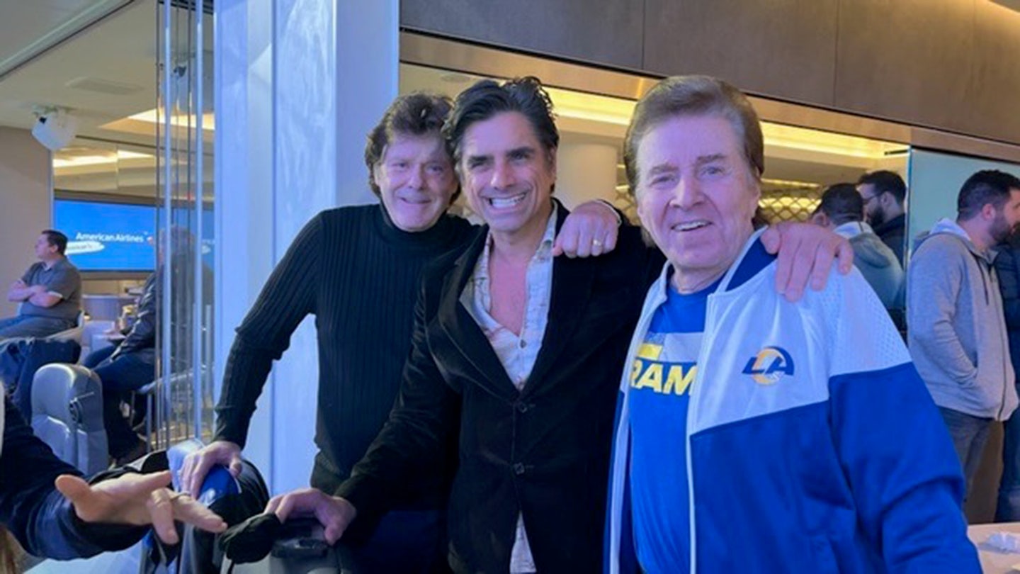 Jerry Schilling, John Stamos and Bobby Sherman attend a Los Angeles Rams sport. (Due to Brigitte Poublon)