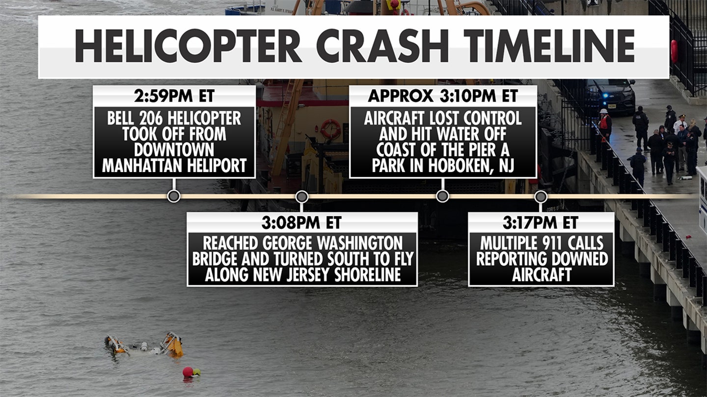 A timeline with the occasions of a deadly helicopter with 5 vacationers and a pilot who had been all killed when the airplane crashed towards the Hudson River on Thursday 10 April 2025. (Fox Information)