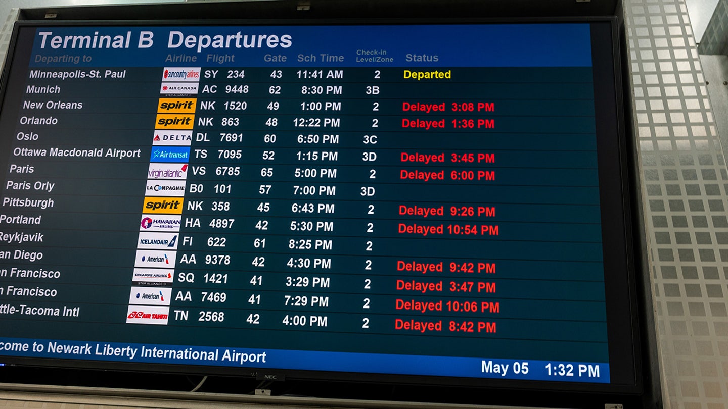 A monitor reveals flight delays at Newark Worldwide Airport on Might 5, 2025. (Spencer Platt / Getty photos)
