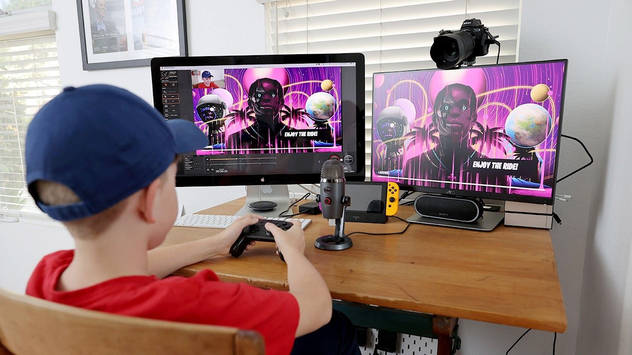 11-year-old photographer son Ansel performs Fortnite with Travis Scott Presents: Astronomical on April 23, 2020 in South Pasadena, California. (Neilson Barnard/Getty Pictures)