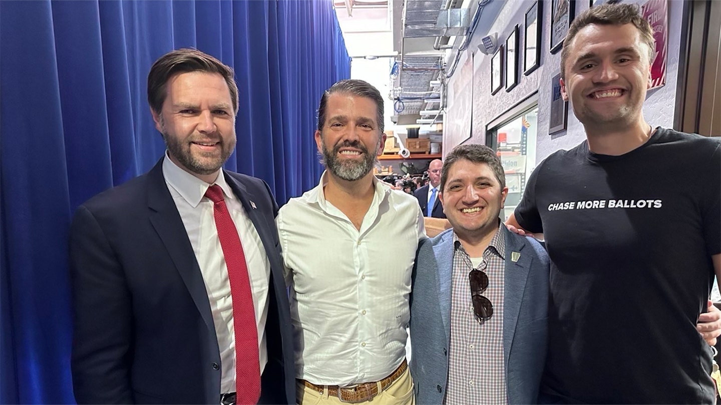 From left to proper: Vice President JD Vance, Donald Trump Jr., Republican strategist Andy Surabian, and co-founder and conservative chief Charlie Kirk. (JD Vance Social Media Put up)
