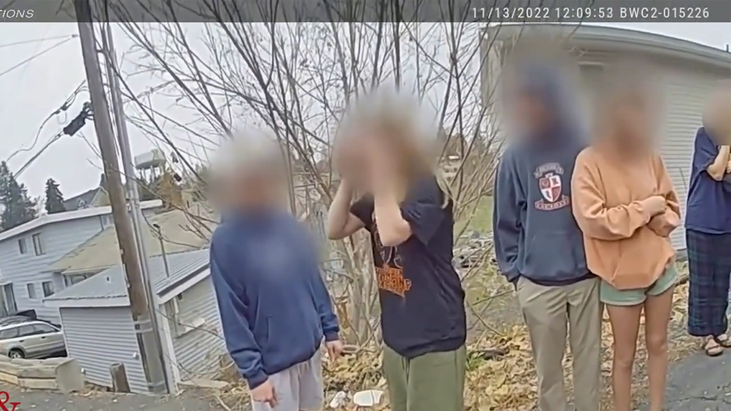 Surviving roommate Dylan Mortensen, middle, and different College of Idaho college students wait exterior the 1122 King Street crime scene Nov. 13, 2022, to talk with police. (Moscow police division)