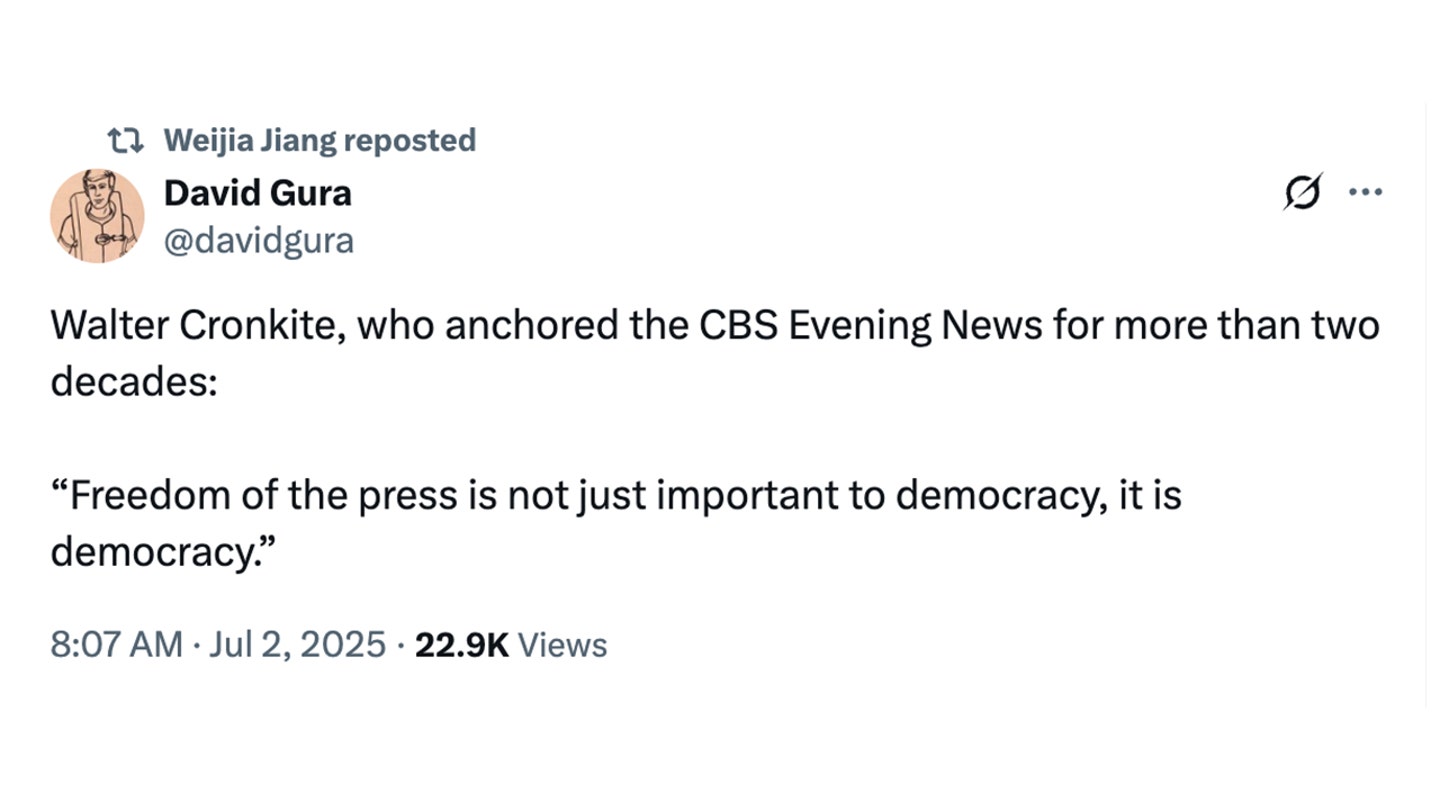 The Senior Correspondent Weijia Jiang from CBS Information took a delicate wipe towards her community by sharing a message on X who calls CBS -legend Walter Cronkite on X. (Screenshot/x)