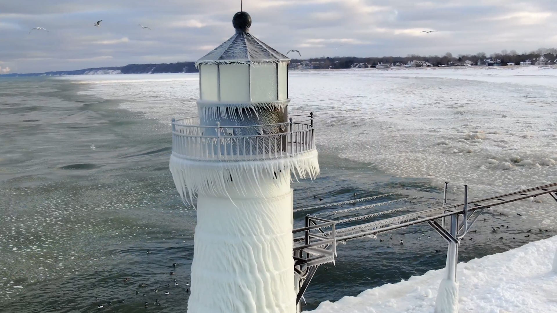 Video reveals ice form on Lake Michigan Lighthouse