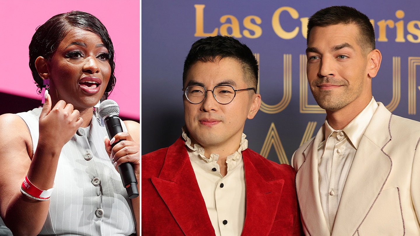 Consultant Jasmine Crockett and comedians Bowen Yang and Matt Rogers (Erika Goldring/Getty Pictures for Essence; Dehlin Spach/Getty Pictures)