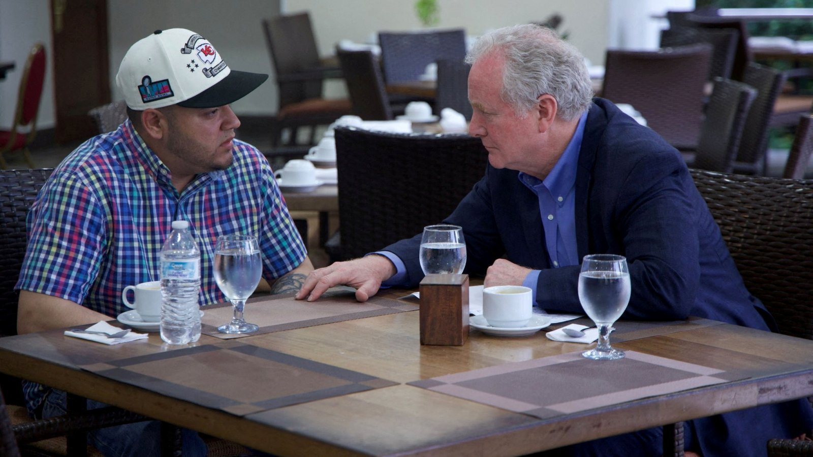 Chris van Hollen, proper, speaks to Kilmar Garcia, left, after he had visited him in El Salvador. (Reuters)
