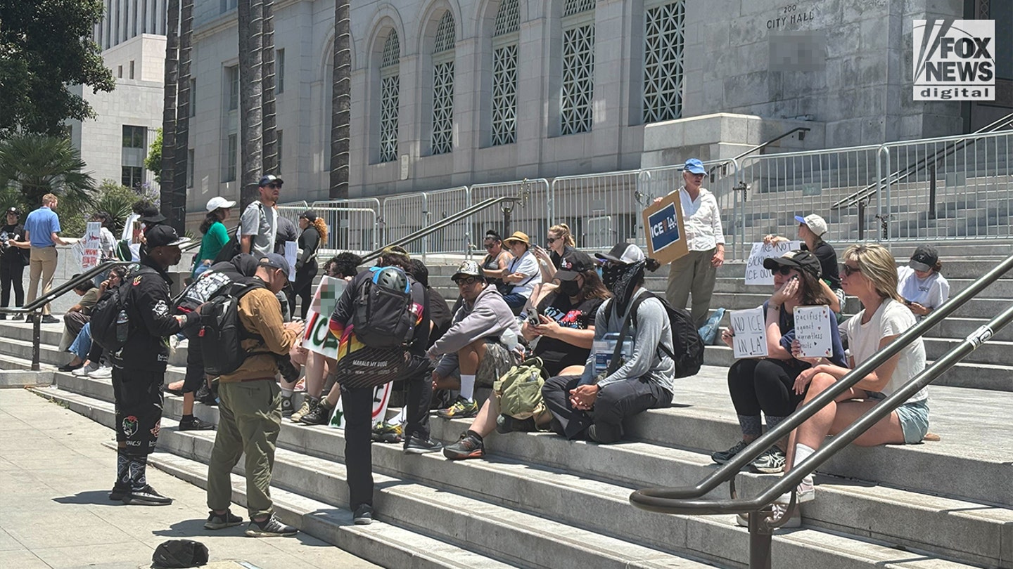 Demonstranten begonnen zich te verzamelen op de trappen van het stadhuis van Los Angeles vroeg dinsdagmiddag na drie dagen van anti-ijsrellen in de stad. (Peter D’Abrosca voor Fox Information Digital)