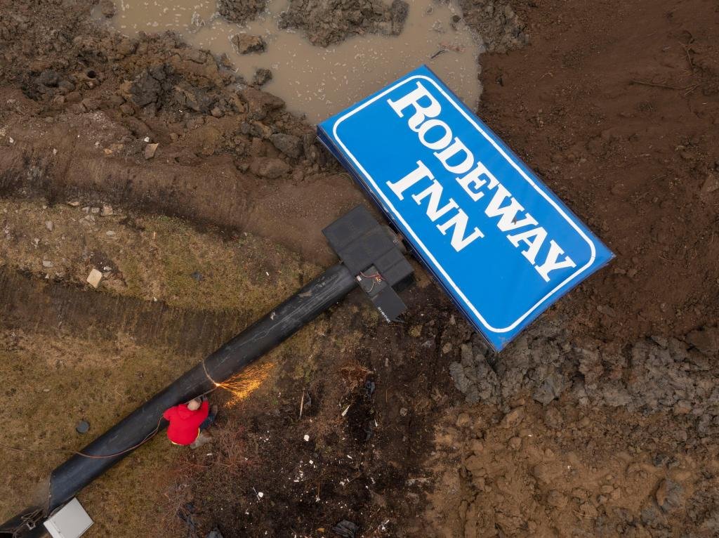 Because the resort was razed, a building crew just lately toppled the towering “Rodeway Inn” signal, sending particles taking pictures up because it hit the bottom.