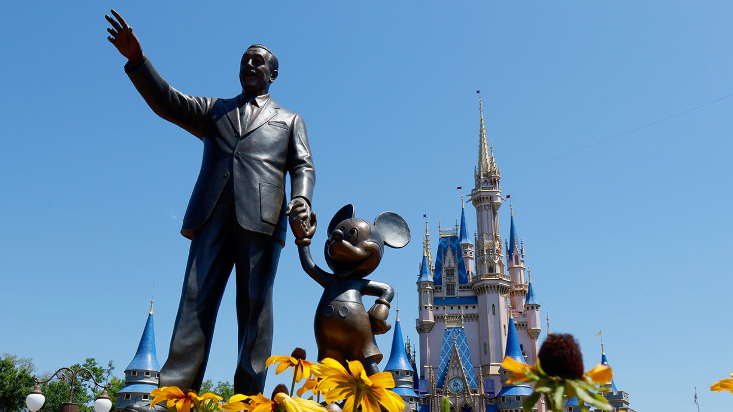 A statue of Walt Disney and Mickey Mouse stands in a backyard at Walt Disney World in Orlando, Florida on Could 31, 2024. (Gary Hershorn/Getty Photographs)