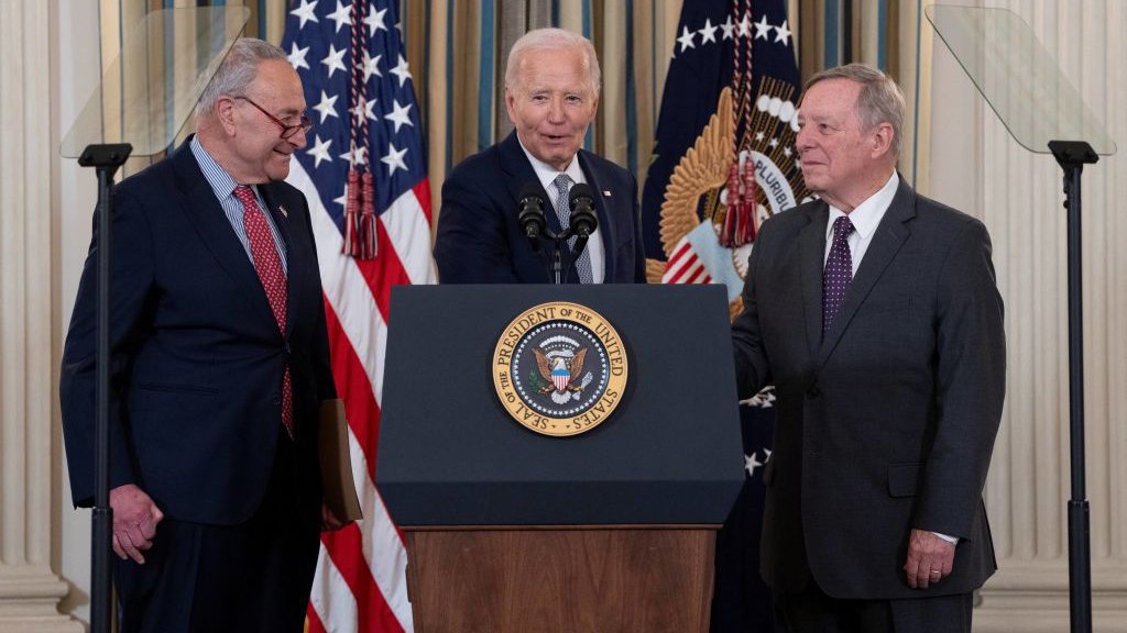 Senator Chuck Schumer, President Joe Biden and Senator Dick Durbin are all thought-about topic to the ‘Biden impact’. (Getty)