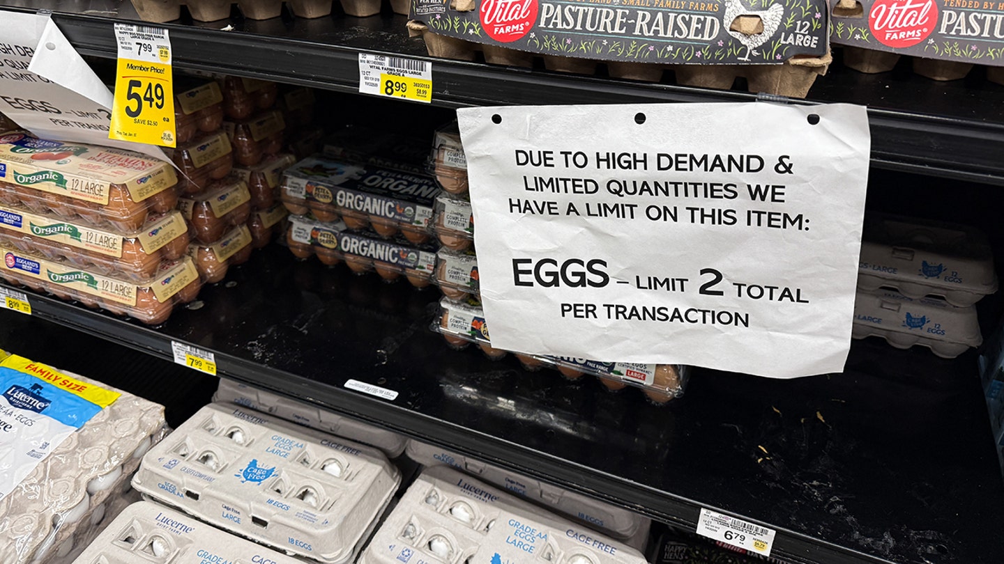 Signposting famous a restrict for portions of eggs in a grocery store in Manhattan Seashore, California, on January 2, 2025. (Patrick T. Fallon / AFP / Getty photos)