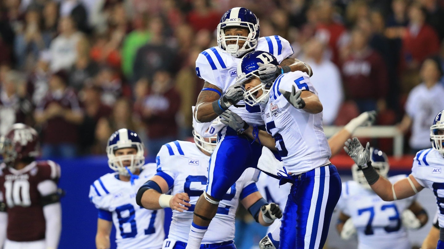 Duke Blue Devils who runs again Josh Snead (9) celebrates his landing with broad receiver Brandon Braxton (5) in the course of the first quarter in opposition to the Texas A&M Aggies within the Chick-Fil-A Bowl 2013 within the Georgia Dome. (Daniel Shirey-usa Right this moment Sports activities)