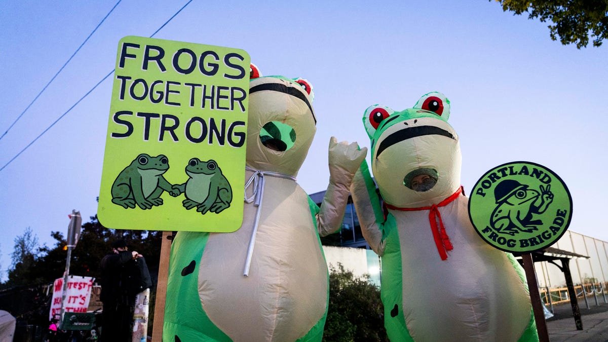 - Protesters in Portland started sporting inflatable costumes earlier this month after a federal agent sprayed a chemical spray into the vent of a protester’s frog swimsuit.