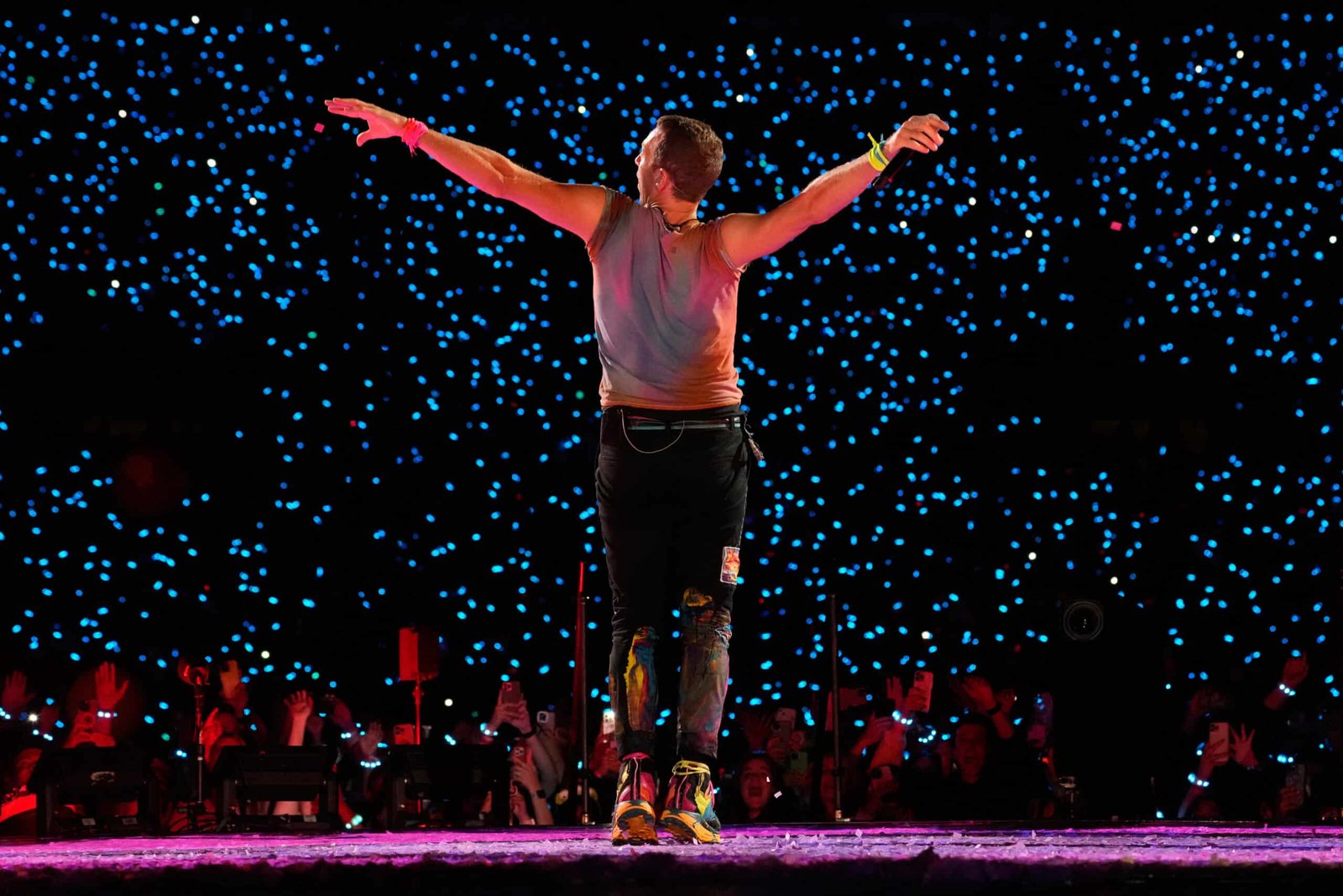 Chris Martin van Coldplay performs in the Rose Bowl