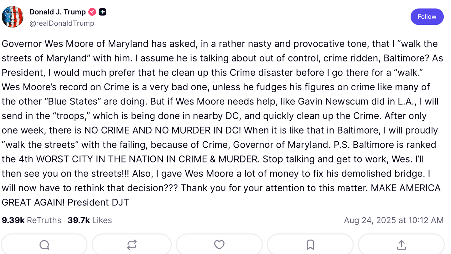 Authorities Wes Moore has invited President Donald Trump to take part in a “security stroll” in Baltimore to emphasise the efforts of crime.