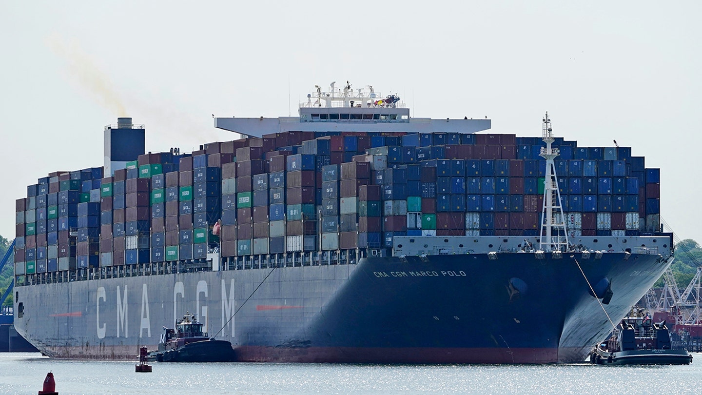 The CMA CGM Marco Polo makes its approach to the Elizabeth-Port Authority Marine Terminal as seen from Bayonne, NJ, Could 20, 2021. (AP Picture/Seth Wenig)