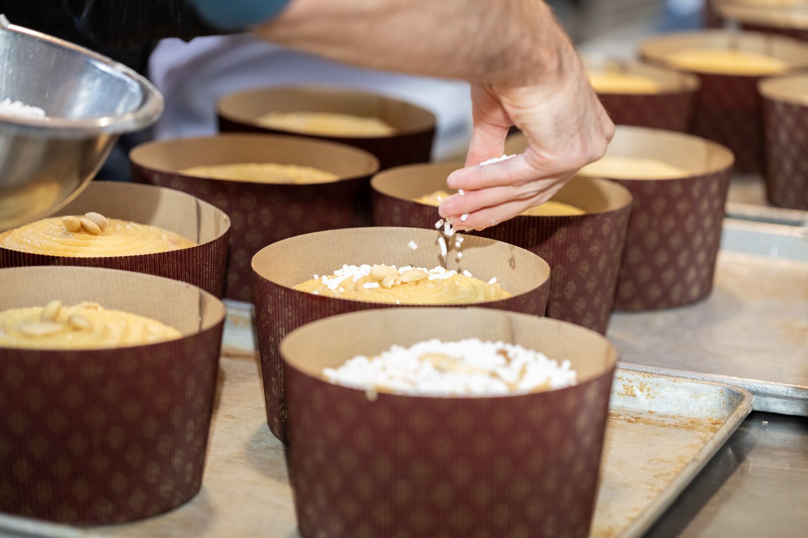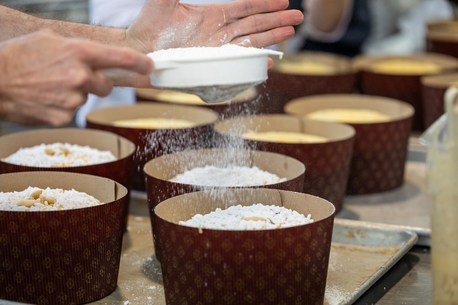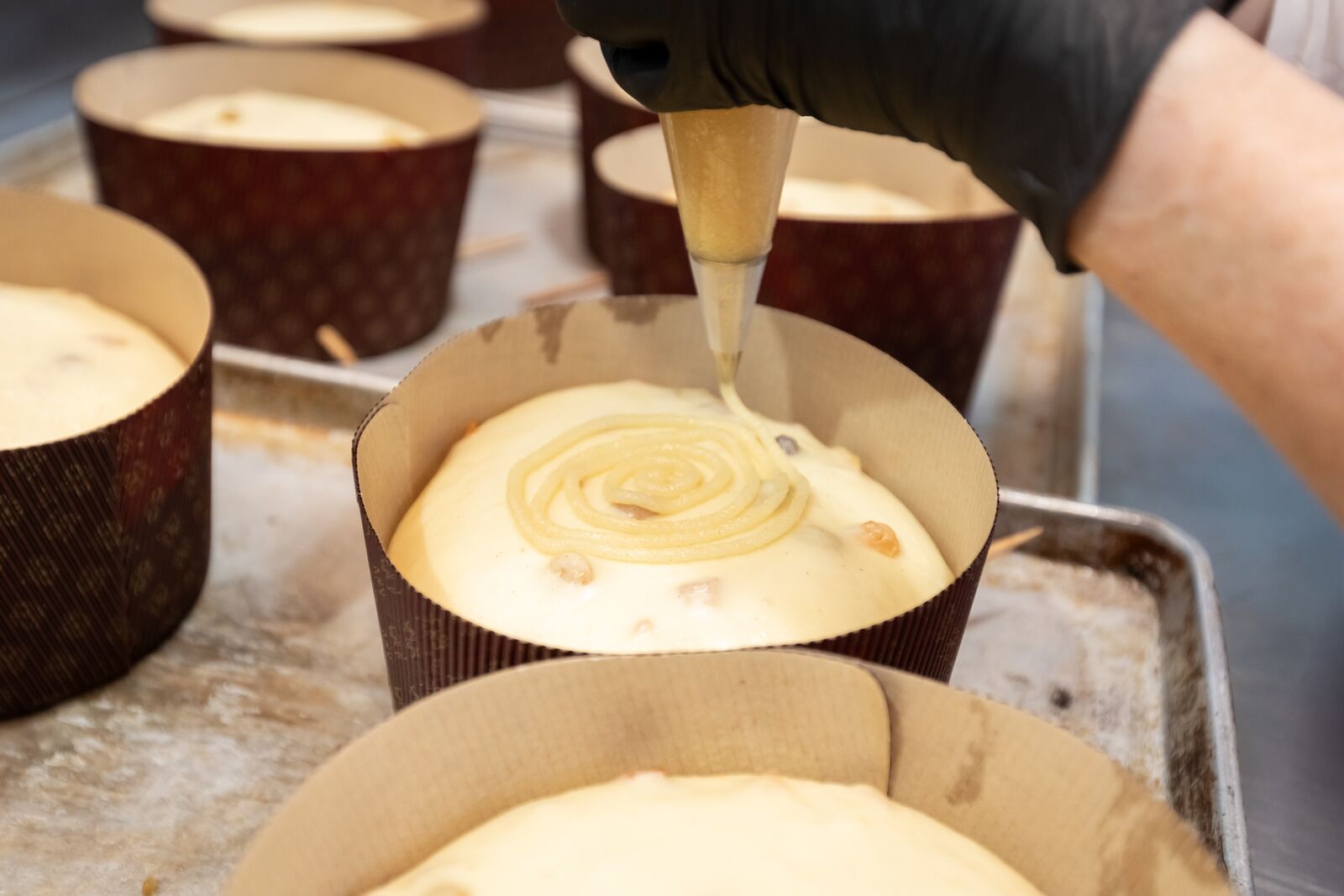 Because the dough mixes, aromatics are added, together with vanilla, lemon oil, orange zest and a “cheap quantity of honey.” The honey provides taste, but additionally retains the bread moist. Then the butter is added, which ought to be at an precisely delicate stage, after which water. Subsequent come the citrus fruits and raisins. The dough (one kilogram per panettone) then ferments earlier than being positioned within the molds, the place it rises. Then the toppings of almond glaze, pearl sugar, blanched almonds and icing sugar are added and the panettone is baked for about an hour. The glaze ensures that the panettoni don’t harden on high and might develop to their full potential peak.