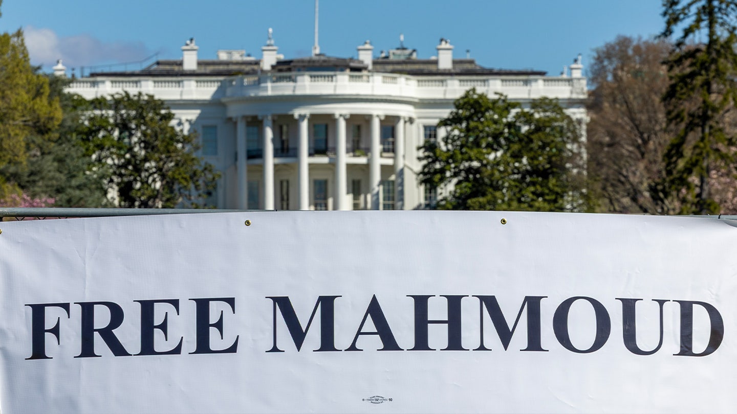 “Win With out Battle Banner” Exterior the White Home on March 26, 2025 in Washington, DC The group calls on President Trump to free Mahmoud Khalil, a Palestinian refugee whose inexperienced card was withdrawn about his involvement in demonstrations at Columbia College. (Tasos Katopodis/Getty Pictures for Win With out Battle)