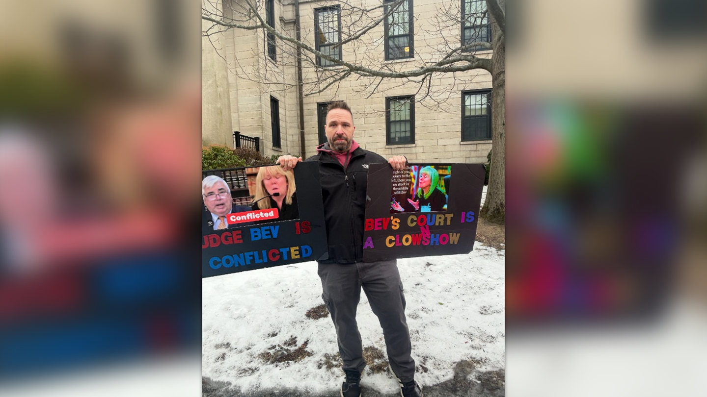 Jason Grant, a demonstrator who has been important of Decide Beverly Cannone, holds drawing outdoors the Norfolk Superior Courtroom in a photograph that’s included in his court docket case {that a} “buffer zone” canceled across the constructing. (American Courtroom for Massachusetts)