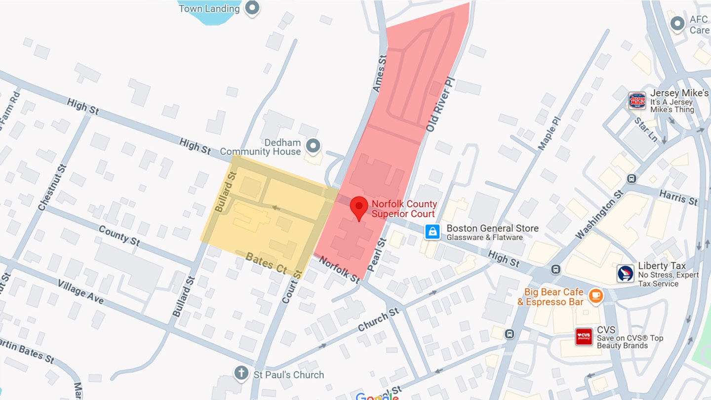 A map of the middle of Dedham, Ma, which reveals the “buffer zone” of the suitable across the Norfolk Superior Courtroom constructing.