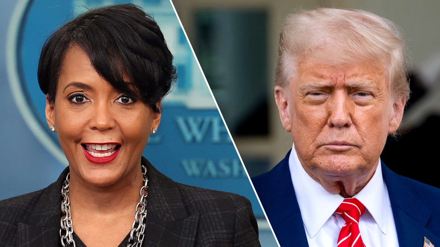 Left: White Home Public Engagement Advisor Keisha Lance Bottoms speaks at a press convention within the White Home on January 13, 2023 in Washington, DC; Proper: President Donald Trump exterior the west wing of the White Home in Washington, DC, on Thursday 8 Might 2025 (Left: Kevin Dietsch/Getty pictures; Proper: Bonnie Money/Upi/Bloomberg through Getty Photographs)