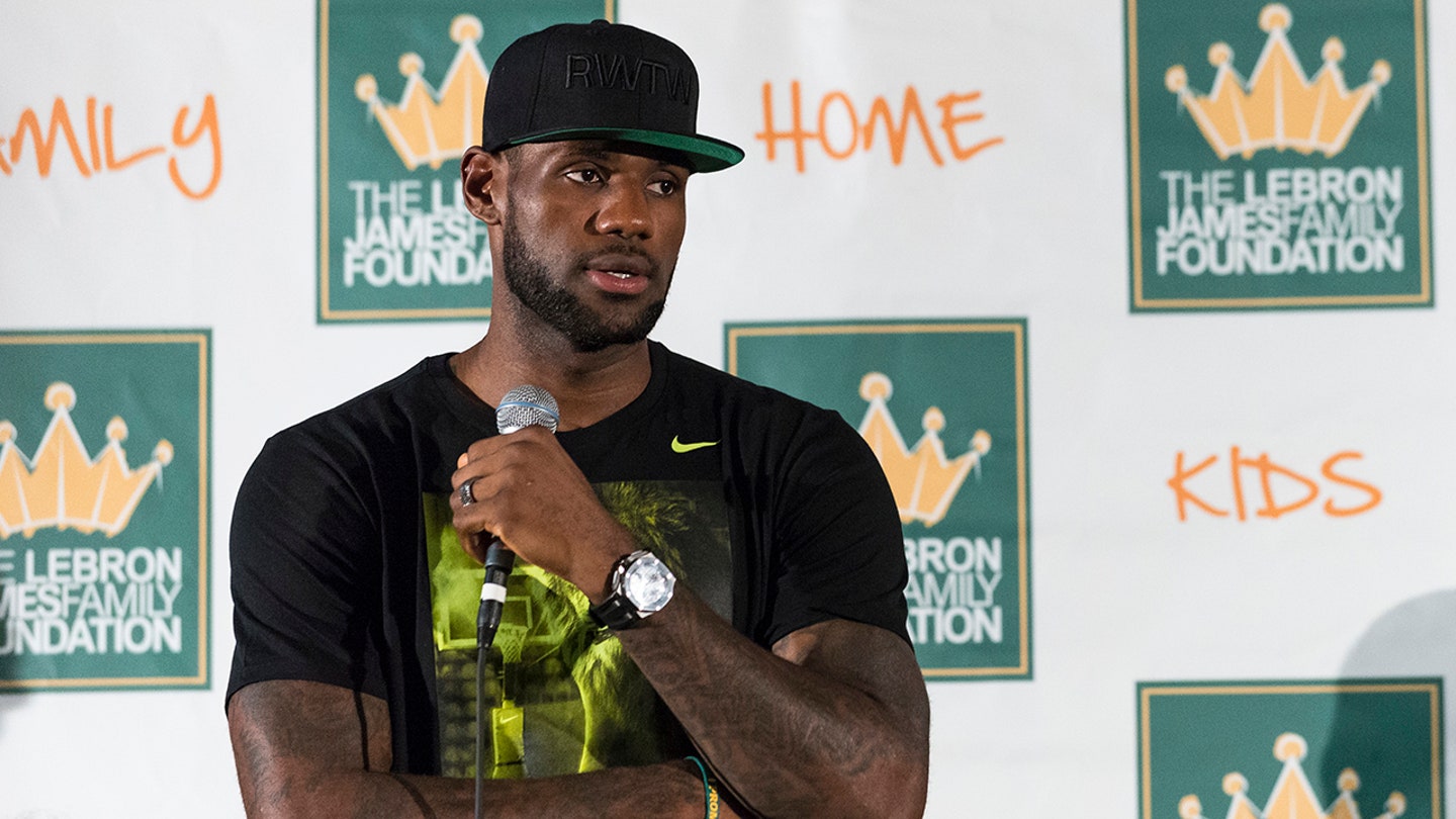 LeBron James solutions questions throughout a press convention on 8 August 2014 in Akron, Ohio, throughout a ceremony in honor of James. (Angelo Merendino/Corbis through Getty photos)