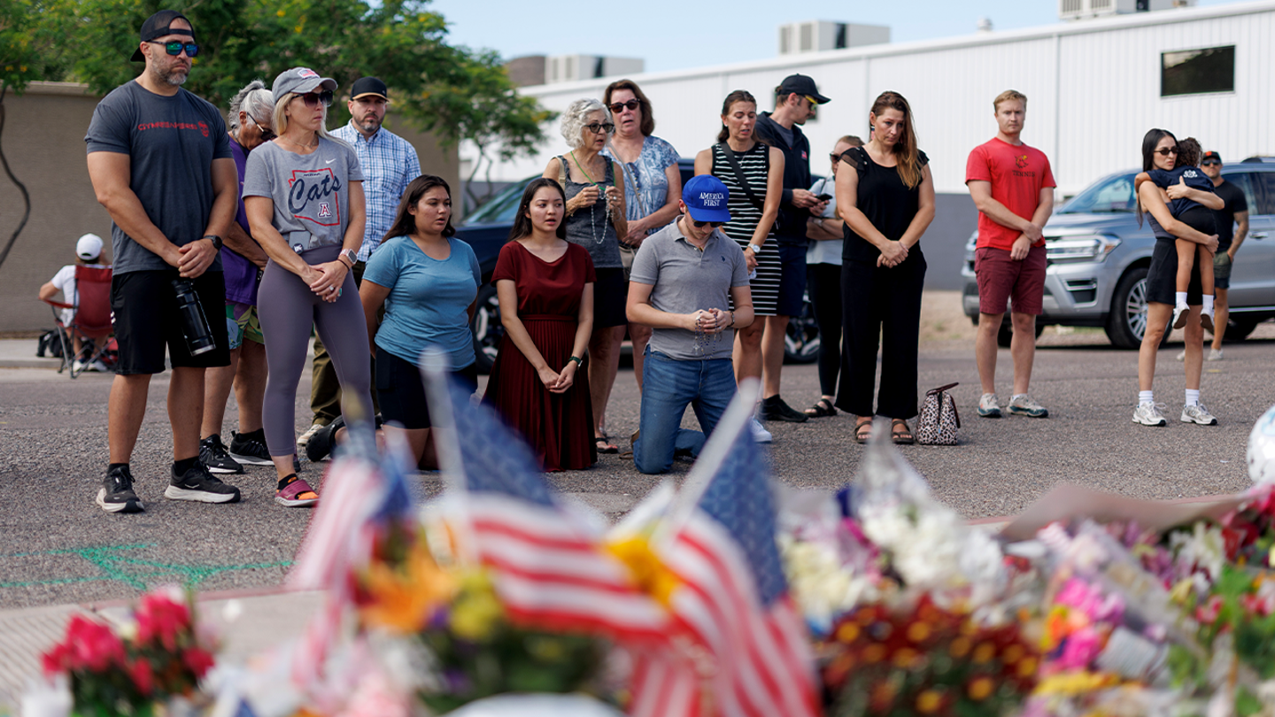 Individuals pray in a monument for Charlie Kirk on the head workplace of the Turning Level USA on 12 September 2025 in Phoenix, Arizona. Kirk, the CEO and co-founder of Turning Level USA, was shot and killed in Utah final week. (Eric Thayer/Getty photos)