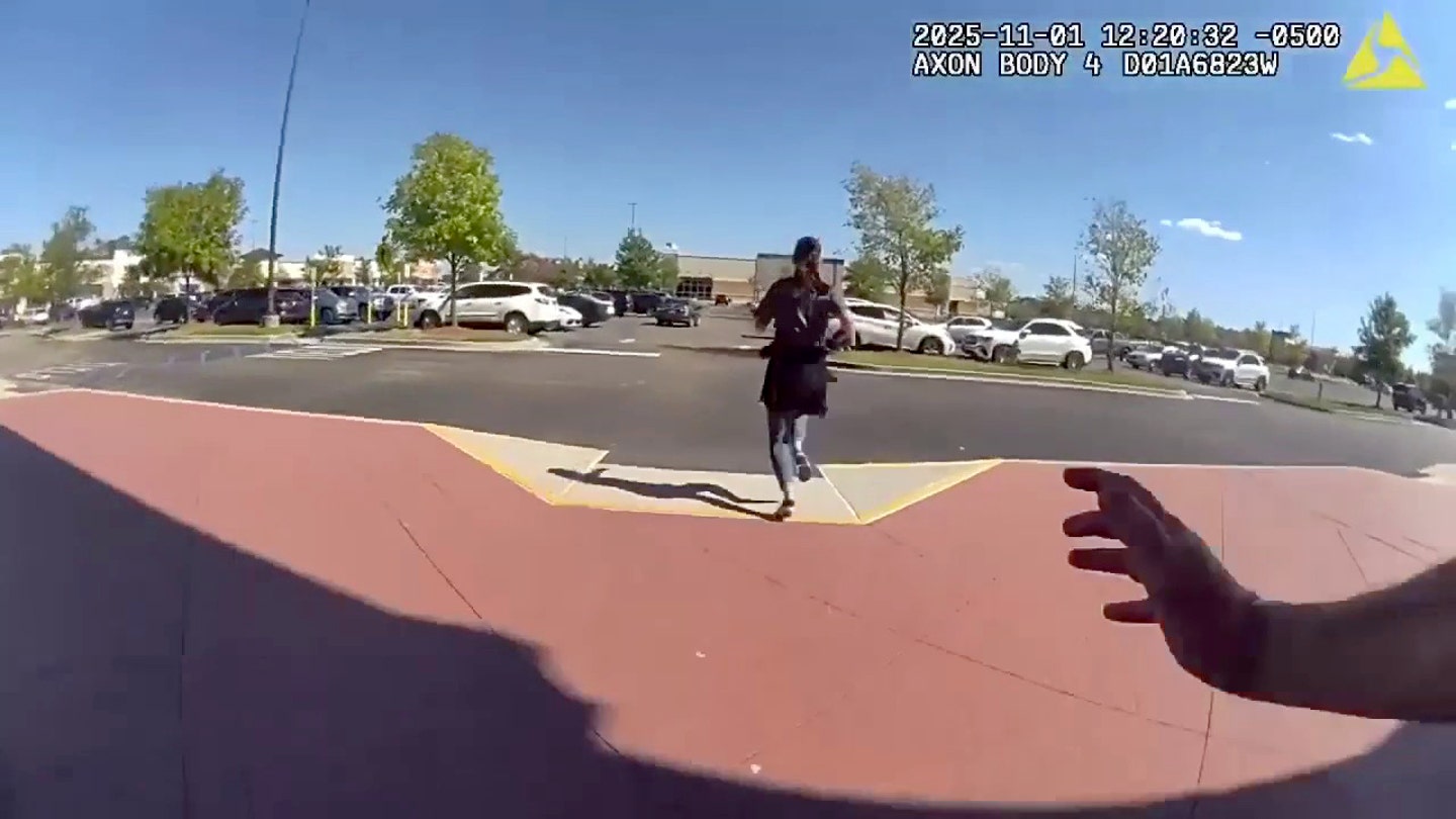 A suspected shoplifter, later recognized as 34-year-old Kelsey Baird, tries to run from Sgt. Jeff Kahrs at a Dillards retailer in Slidell on Saturday, November 1, 2025. (Slidell Police Division)