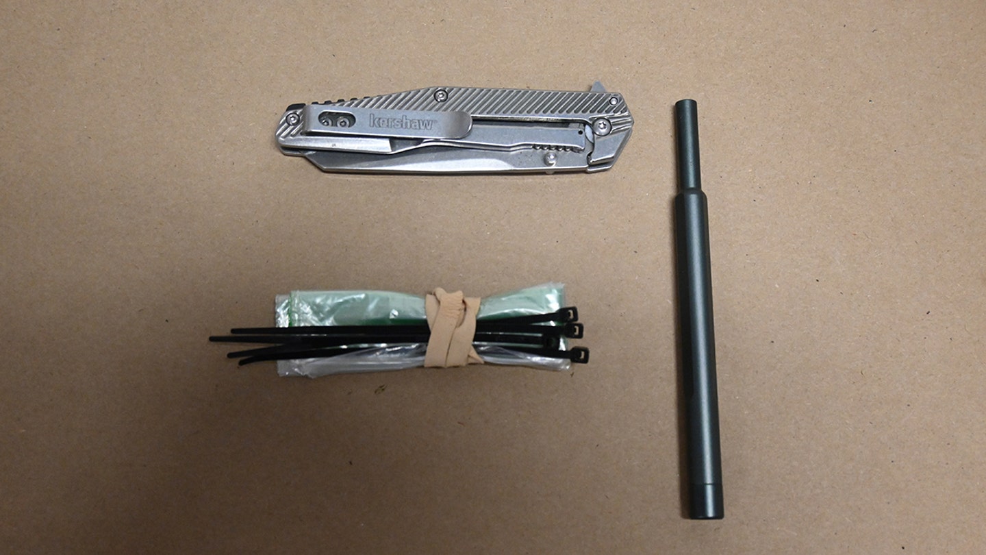 Proof collected after Luigi Mangione’s arrest and introduced by the Manhattan district lawyer at a suppression listening to is proven right here. Pictured: Mangione’s pocket knife, zip ties and instruments. (Manhattan District Lawyer’s Workplace)