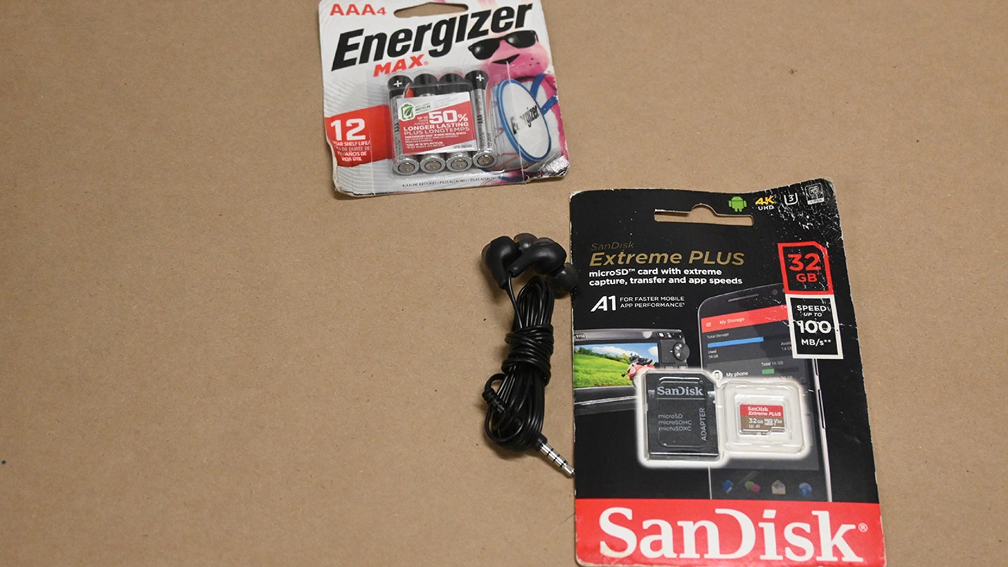 Proof collected after Luigi Mangione’s arrest and introduced by the Manhattan district lawyer at a suppression listening to is proven right here. Pictured: Mangione’s reminiscence card, headphones and batteries. (Manhattan District Lawyer’s Workplace)