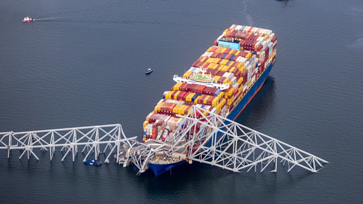 The container ship Dali is seen within the wreckage of the Francis Scott Key Bridge, almost every week after it struck a structural pier, inflicting the bridge to break down, April 1, 2024. (Jerry Jackson/The Baltimore Solar/Tribune Information Service/Getty Photographs)