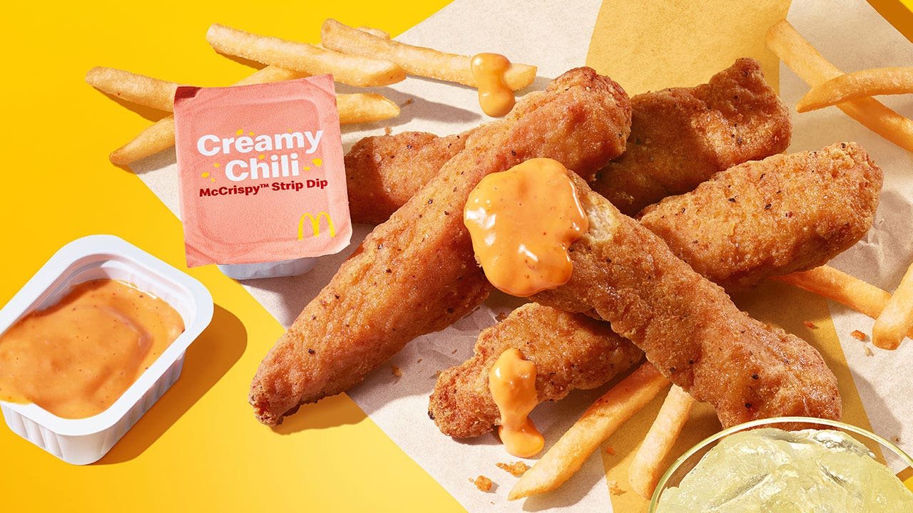 McDonald’s McCrisSpy Strips will launch a brand new, creamy chili sauce subsequent to them. (McDonald’s)