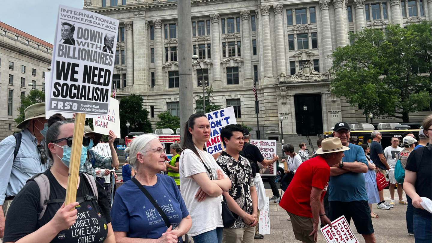 On Might 1, 2025, members of the Freedom Highway Socialist Group protested in Washington, DC, blocks from the White Home, in help of labor rights. “DOWN WITH BILLIONAIRES,” learn an indication with a picture of Elon Musk. ‘WE NEED SOCIALISM.’ (Asra Q. Nomani)