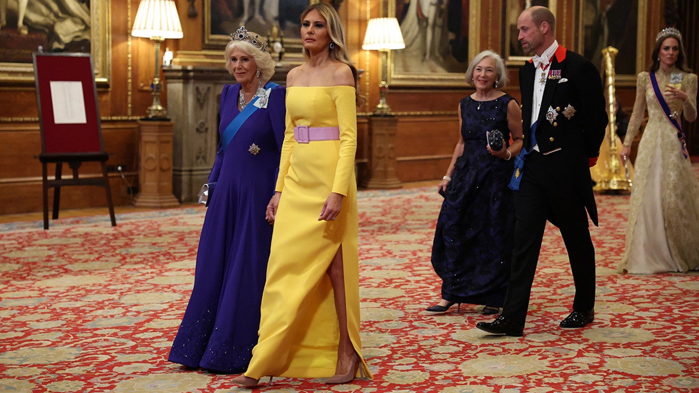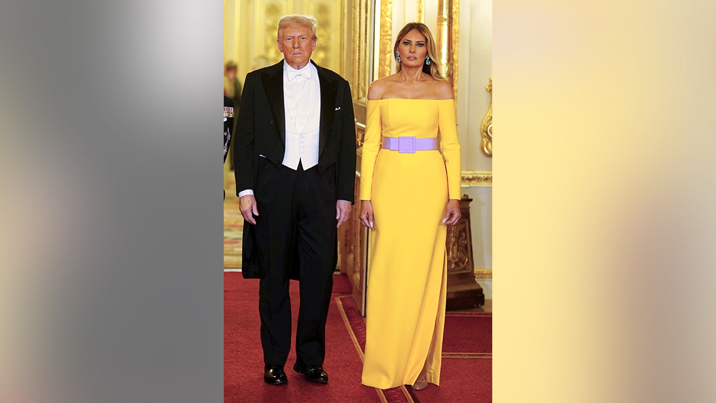 Melania Trump opted for a yellow off-shoulder costume for the state banquet. (Phil Noble – WPA Pool/Getty pictures)