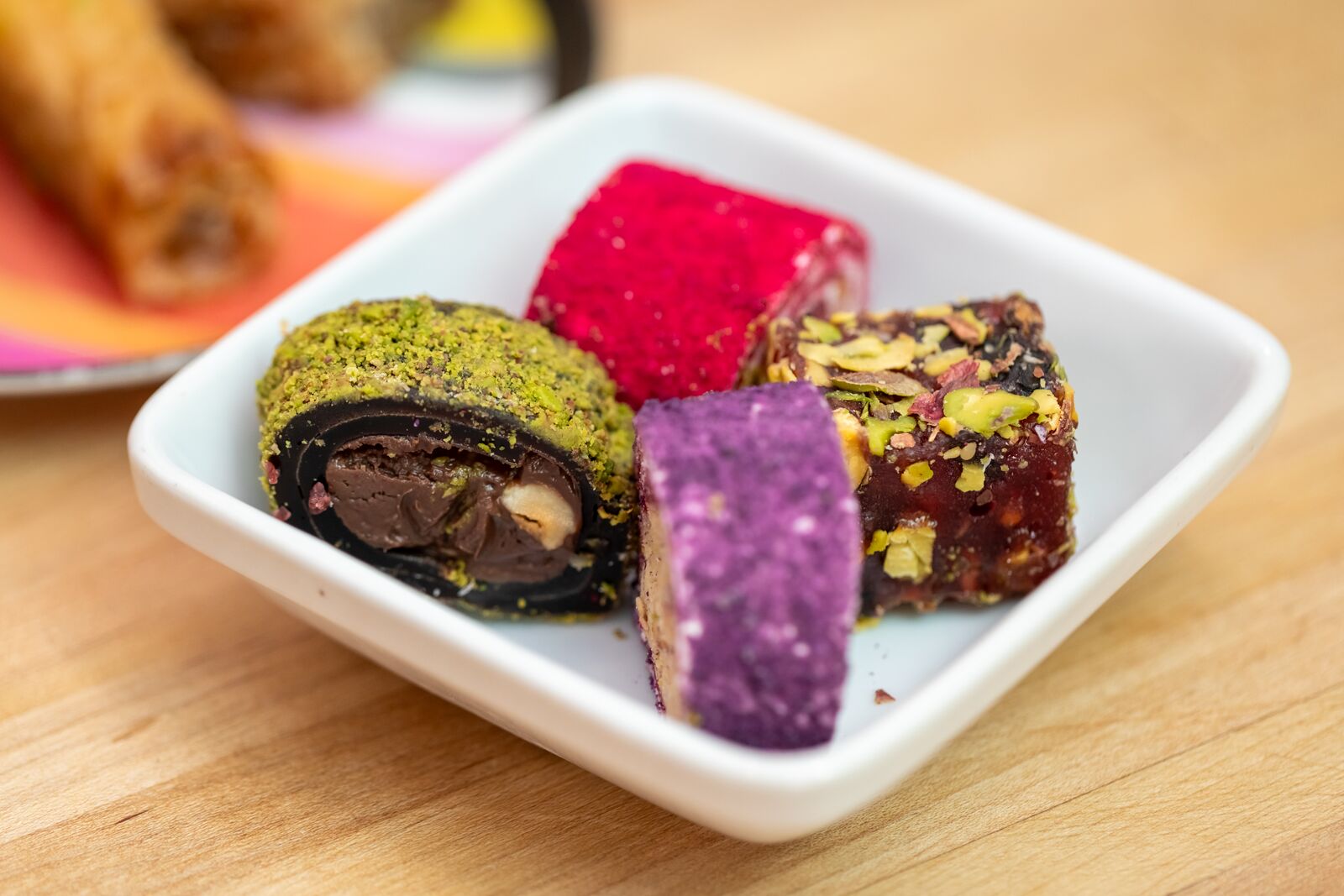For dessert you may order a plate of varied baklava or Turkish delicacies. However a visit past the Center Jap market will reveal a multi-colored kaleidoscope of those sweets to select from, in flavors resembling pistachio, mulberry, kiwi, blueberry, mango-coconut, chocolate-hazelnut and rose petals with pomegranate.