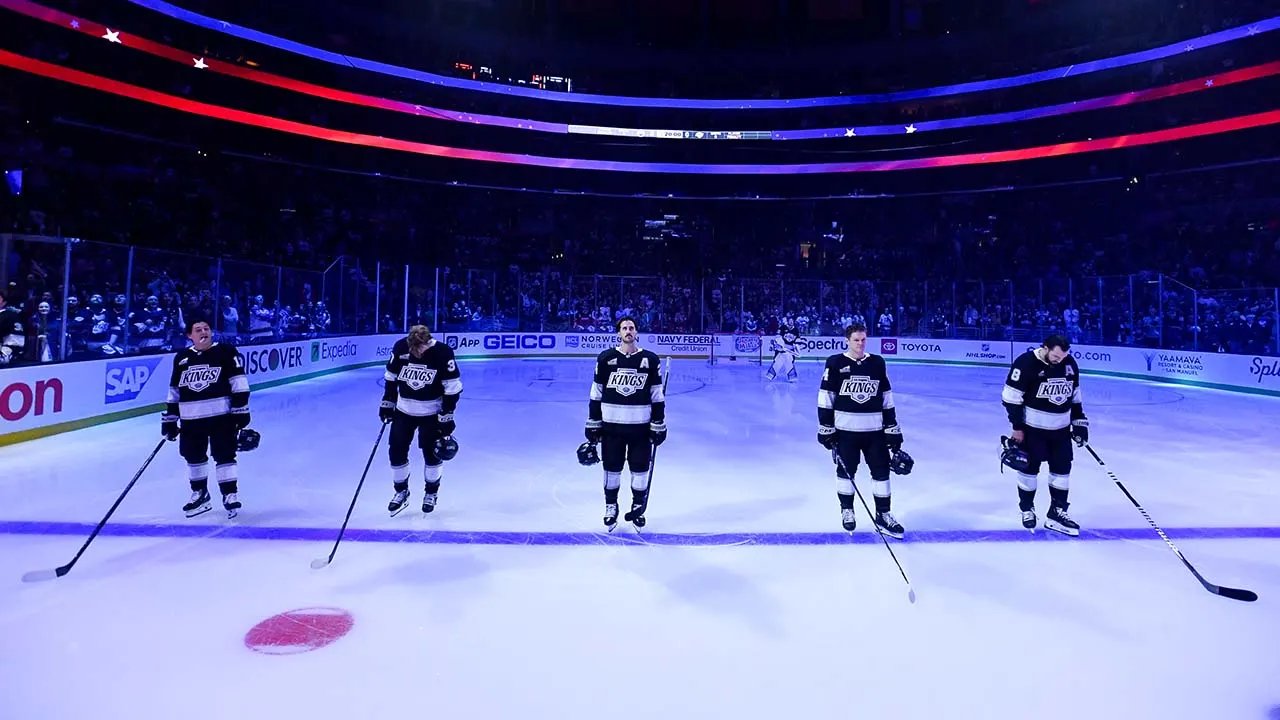 Los Angeles Kings gamers throughout the nationwide anthem earlier than Recreation 1 of the primary spherical of the Stanley Cup Playoffs 2025 towards the Edmonton Oilers in Crypto.com Area 21 April 2025, in Los Angeles. (Juan Ocampo/NHLi through Getty photographs)