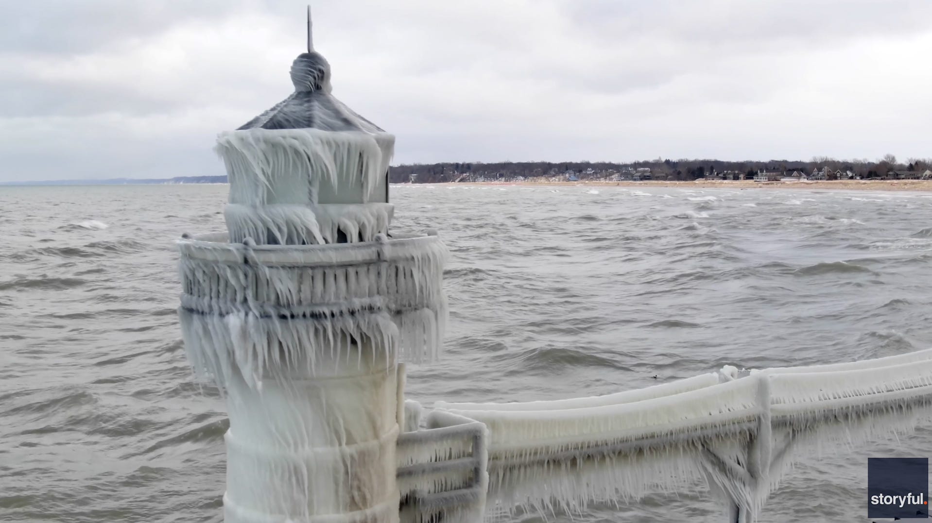 Lighthouse on Lake Michigan freezes into an icy miracle after storm