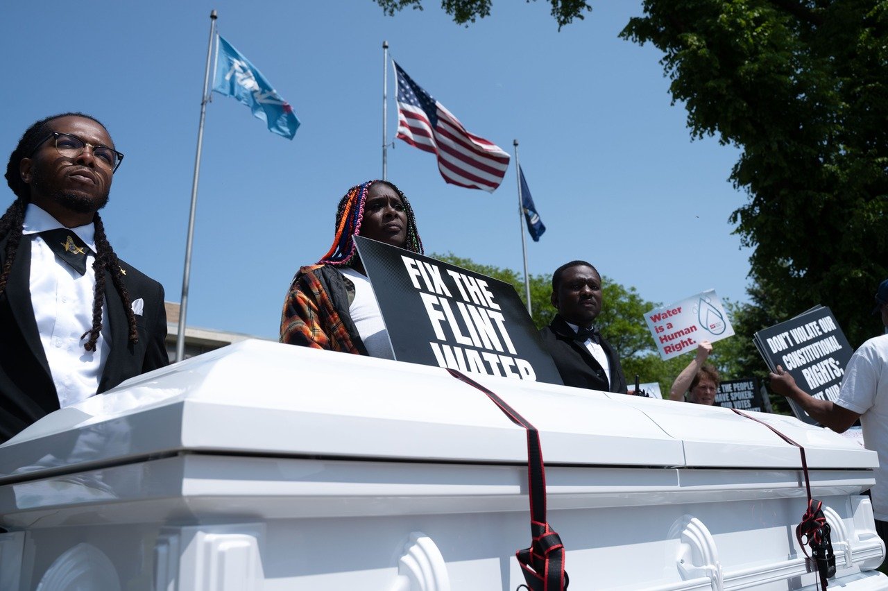 A few of them gathered referred to the dealing with of town of the Flint Water Disaster and the lengthy look ahead to settlement funds, with a number of holding boards with the textual content: “Water is a human proper.”