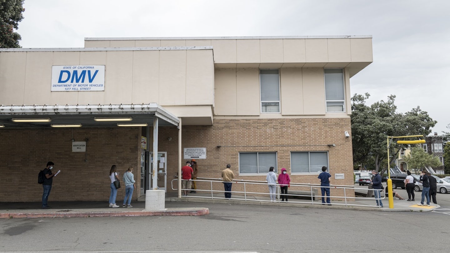 Individuals wait on 11 Could 2020 in line on the Division of Motor Autos in San Francisco. (David Paul Morris/Bloomberg by way of Getty)