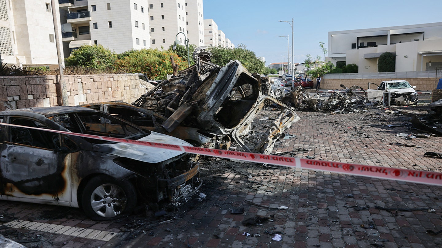 A photograph taken within the southern Israeli metropolis of Ashkelon on October 7, 2023 reveals burnt-out automobiles exterior a residential constructing that was hit by a rocket assault from the Gaza Strip. (Ahmad Gharabli/AFP by way of Getty Photos)