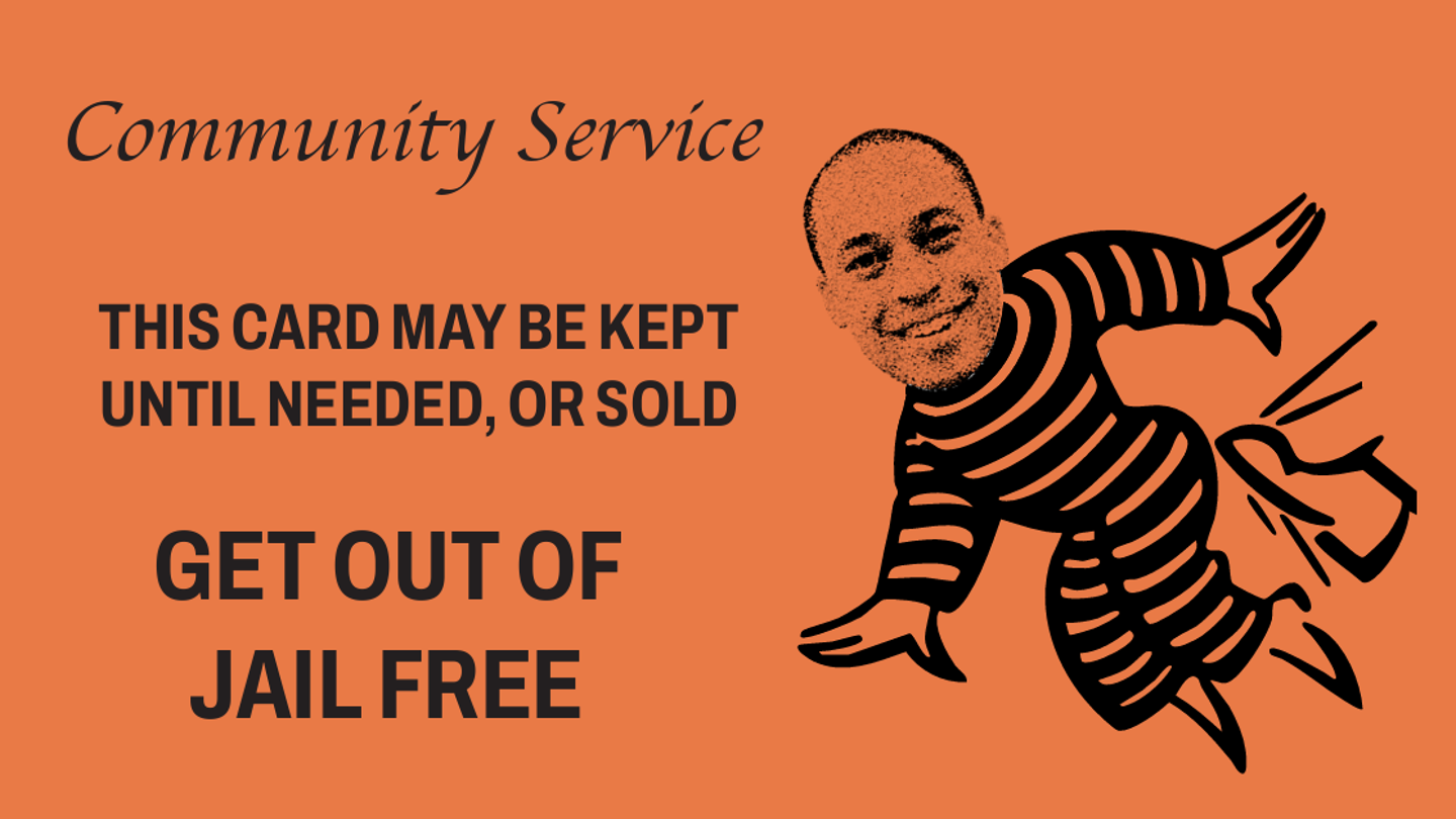 Some playing cards included an orange “Probability” card that learn “Guidelines for Jay, however not for you” – “Social Service for Political Acquire” – “Paid by Legislation Agency for Neighborhood Service” – “Now Underneath Legal Investigation for Fraud.”