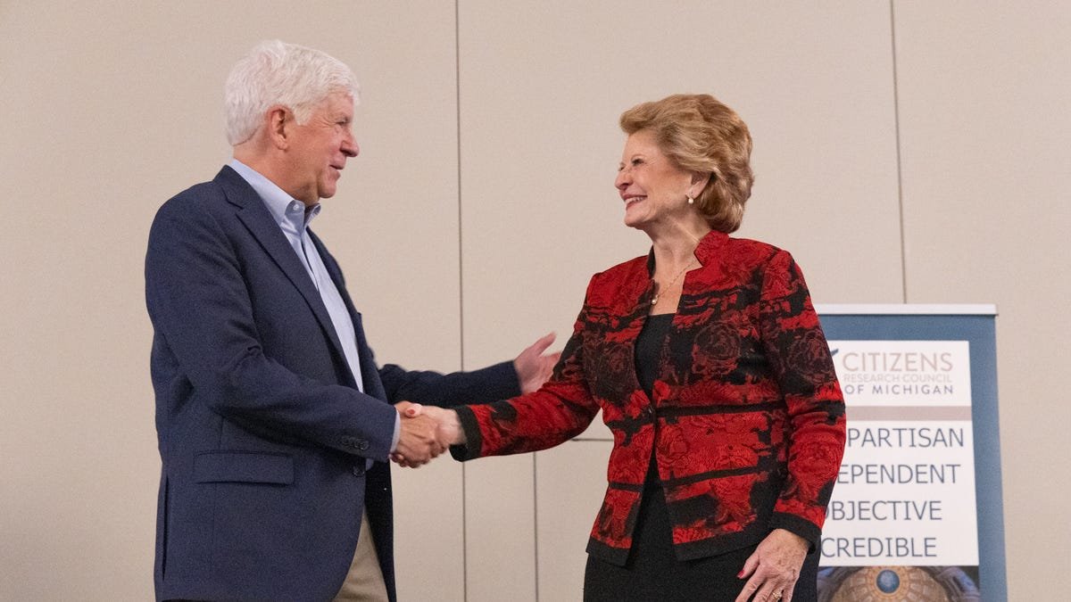 • Former leaders of Michigan Rick Snyder (R) and Debbie Stabenow (D) had been honored for his or her a few years of public service on the annual public coverage dinner of the Residents Analysis Council.