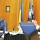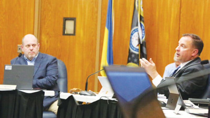 Clinton Township Supervisor Paul Gieleghem, left, speaks on the assembly of April 28 Clinton Township Board of Trustees as Trustee Dan Kress Watches. Picture by Dean...