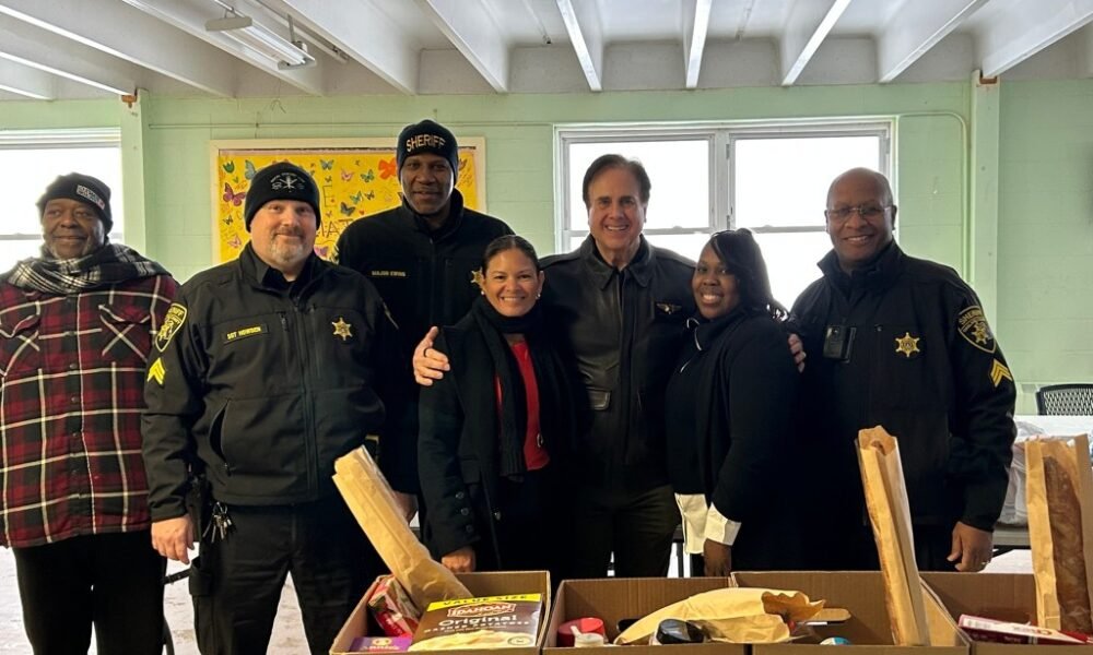 Oakland County Sheriff Michael Bouchard and others helped distribute non-perishable meals objects to Pontiac residents in want on Jan. 21 on the Baldwin Middle in Pontiac....