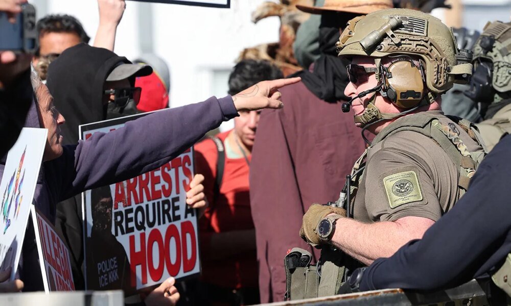 Protesters entice federal brokers throughout a raid Activists use a bicycle lock to entice regulation enforcement officers in a taco store car parking zone throughout an...