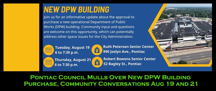Pontiac Council exchanges about new buy of DPW buildings, neighborhood interviews 19 and 21 August (Metropolis of Pontiac, August 13, 2025) Pontiac, Mi – Take part...