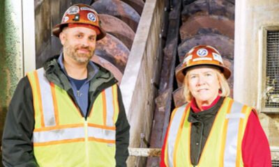 Macomb County Public Works Commissioner Candice Miller and Vince Astorino, operations supervisor of the Southeast Macomb Sanitary District, stand in entrance of the big screw pumps...