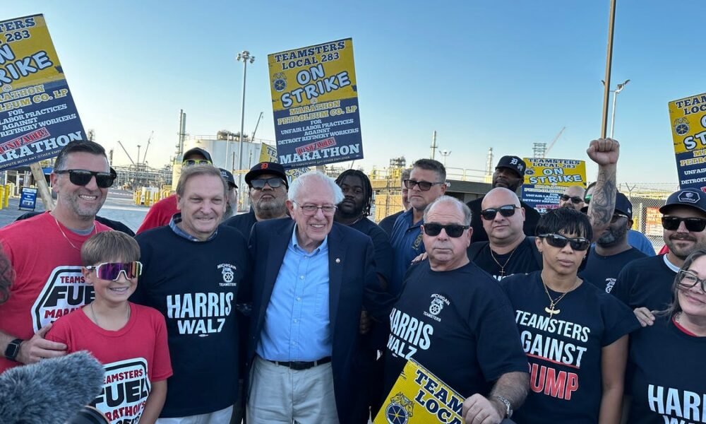 Bernie Sanders joins Picket Line within the southwest of Detroit Kevin Moore, president of the Michigan Teamsters, introduces the American senator Bernie Sanders, I-Vermont, who speaks...