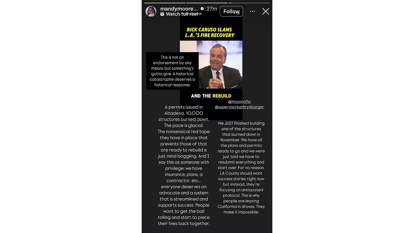 Mandy Moore known as La County in regards to the “meaningless protocol” to stop communities from rebuilding after fires had destroyed hundreds of buildings in January.