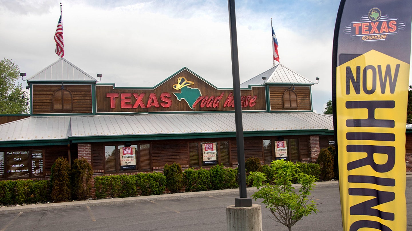 A banner promoting “Now recruitment” could be seen exterior Texas Roadhouse Restaurant on Friday, June 4, 2021 in Colonie, NY (Lori van Buren/Albany Occasions Union by way of Getty Photographs)